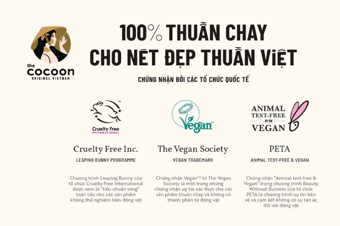 Cocoon là thương hiệu Việt Nam đầu tiên đạt chứng nhận Leaping Bunny (Cruelty Free International) và The Vegan Society. Về việc cam kết 100% không thử nghiệm trên động vật và không sử dụng nguyên liệu từ động vật, điều này đã giúp Cocoon chiếm trọn tình cảm của thế hệ Gen Z – những người coi trọng quyền động vật.